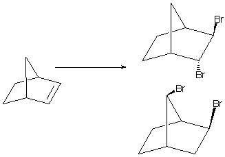 Its noteworthy that the same effect is seen for reaction between norbornene and the electrophiles Cl2 and ICl. I2 however gives an anti-1,3 product, whilst F2 (actually XeF2) gives a syn 1,2 product, maybe by direct quenching of the non-classical carbonium ion, which becomes possible because the F is much smaller sterically than the Br.