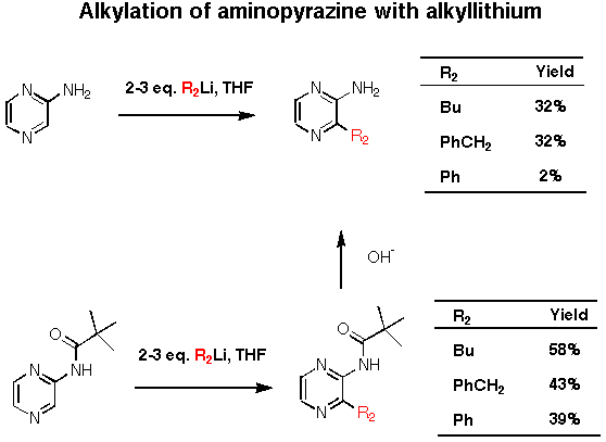 Regioselective alkylation at the 3-position of 2-amino or 2-acylaminopyrazine was achieved with organolithium in THF at -20