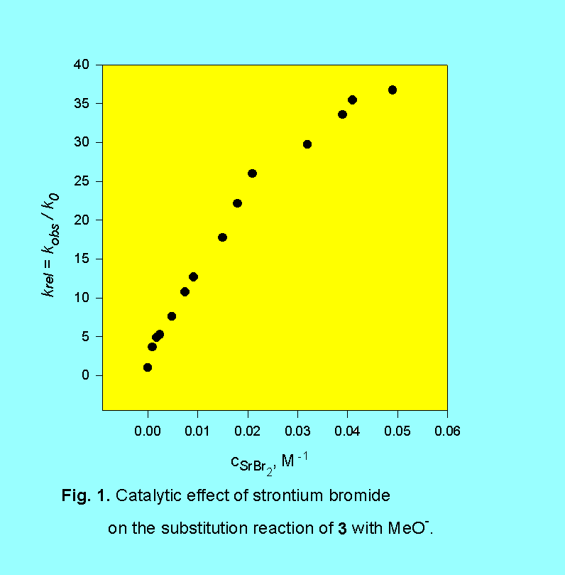 The existence of a remarkable catalysis indicates that strontium stabilizes the transition state of this reaction more than the corresponding ground state. 1>2 To the ground state stabilization concur the coordination of metal cation by the substrate and by the methoxy cation, that are expressed by the substrate binding constant KSub = 12 dm3 mol-1 (determined by 1H NMR) and by the methoxide binding constant KMeO , Scheme 2, whose value is not firmly determined, but seems to vary between 20-100 dm3 mol-1. 1a,3,4