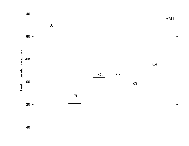 From the experimental data, we know that isomer B is not formed, but one of the isomeric structures C. Interestingly, the AM1 calculation suggests that B lies lower in energy than all of the C isomers, while PM3 attributes a very similar energy to isomer C3. From a purely thermodynamical point of view, B might therefore be an intermediate in the formation of only C3. This can be excluded, however, for geometric reasons, since there is no sterically reasonable way how the oxygen could be transferred back from the carbonyl carbon to sulphur.