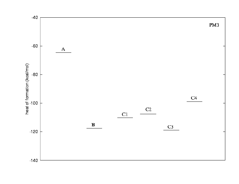 Generally, the ring closure of the two C-C triple bonds is energetically highly favoured; going from A to B lowers the energy by 65 kcal/mol (AM1) or 53 kcal/mol (PM3). This suggests that ring strain in the products is not important for the energetics of the reaction. Due to limitations of the calculations by the size of the molecules, one cannot use ab initio methods to explore how platinum lowers the energy barrier for the reaction.