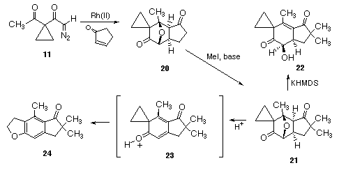 In our illudin and pterosin effort, the cycloaddition of 11 proceeded readily with cyclopentenone giving cycloadduct 20 as a 4:1-mixture of exo and endo isomers in 86% yield. The structure of the major diastereomer of 20 was unequivocally established by an X-ray crystal structure (see Figure 1). Isolation of exo-20 as the major stereoisomer establishes the feasibility of the planned convergent approach to the illudin family as outlined in the retrosynthetic Scheme I.
