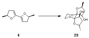 This result forced us to abandon the use of vinyl stannane methodology in favour of more traditional dihydrofuran anion formation. Benzenesulfinic acid was eliminated from the anomeric sulfone 19 to give the dihydrofuran 22 using methodology developed within our group.[6] The volatility of 22 necessitated its isolation by distillation and its use as a 4% solution in THF. Anion formation and application of the coupling conditions established for bis-dihydropyran[7] gave the desired (S,S) dimethyl bis-dihydrofuran 4 (Scheme 6).