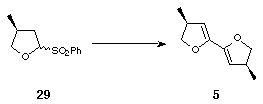 The second class of ligands required the preparation of the 4,4'-dimethyl-substituted bis-dihydrofuran 5. This was synthesised from the commercially available butyrolactone 28 using the anomeric sulfone methodology that had already been established for the synthesis of 4. Thus DIBAL-H reduction of 28 followed by treatment with benzenesulfinic acid furnished the anomeric sulfone 29. Elimination, vinyl anion formation and application of standard bis-dihydrofuran coupling conditions[7] afforded the desired (S,S) dimethyl bis-dihydrofuran 5 (Scheme 9).