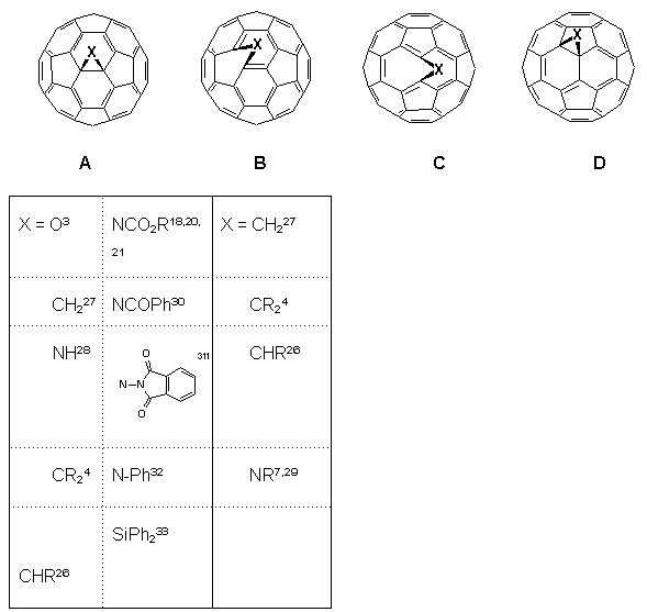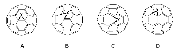 Figure 1. Four possible regioisomers arising from addition reactions of C60 (reported compounds indicated).