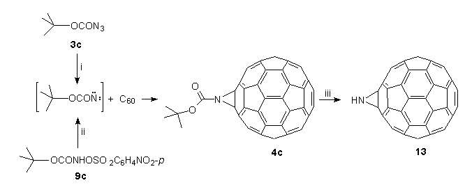 Compared to the 6,6-bridged aziridinofullerenes 4a,b, heating of the tert-butoxycarbonyl derivative 4c follows a separate pathway with simultaneous loss of isobutene and CO2 to form aziridino[2',3':1,2][60]fullerene (C60NH) 13, which in sharp contrast to C60O is a thermally stable derivative which can be heated in boiling TCE (147C) without change. Thus, the synthesis of bronze-coloured 13 is conveniently achieved by a two-step process as outlined in Scheme 6.