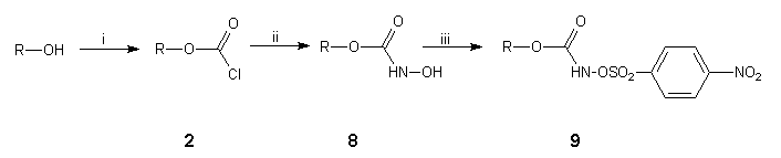 Scheme 3. Reagents and conditions: (i) n-butyl lithium, phosgene, DME, 0°C, 98%; (ii) hydroxylamine hydrochloride, potassium carbonate, calcium hydride, DME, 85°C, 94%, (iii) n-butyl lithium, n-hexane:diethyl ether, -78°C, then 4-nitrophenylsulfonyl chloride, 85%.