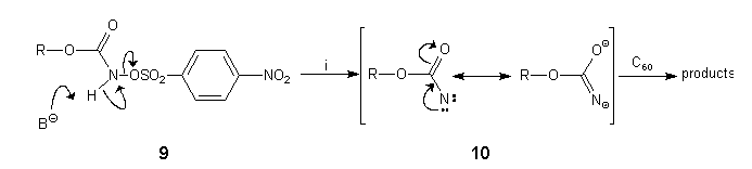 Following this demonstration of the applicability of the base-induced -elimination reaction as a practicable route to aziridinofullerene 4a, we turned our attention to an investigation of the effect of substituting an alkyl group in place of the supermesityl moiety. To this end we synthesised both ethyl- and tert-butyl- O-4-nitrophenylsulfonylhydroxamic acid derivatives 9b16 and 9c20 in good yield. When C60 was treated with the ethyl analogue 9b under phase-transfer conditions at room temperature, N-ethoxycarbonylaziridino[1',2':2,3][60]fullerenene 4b was formed in 65% yield and could be easily separated from unreacted C60 by flash chromatography on silica (toluene:hexane 1:10). The 13C NMR spectrum (62.5 MHz, CS2/CDCl3) of isolated 4b was as expected for a derivative of C60 with C2v symmetry and consisted of 13 lines of intensity 4 and 3 lines of intensity 2 in the sp2 region between 139.7 and 144.9, together with a diagnostic line of intensity 2 in the sp3 region at 80.5; the resonances for the ethoxycarbonyl moiety were observed at 14.5 (CH3), 64.0 (CH2) and 155.5 (C=O). The 1H NMR spectrum of 4b consisted of a triplet ( 1.60, J = 7.1 Hz) and a quartet ( 4.5, J = 7.1 Hz), whilst its FT-IR spectrum exhibited strong bands at 1743 (C=O) 1228 (C-O), and 526 cm-1. FAB-MS analysis confirmed that the product was indeed a mono-adduct [(M++1) 808.04274, C63H6NO2 requires 808.03985].