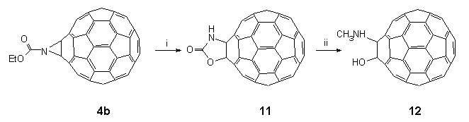 In a further significant development to these findings, treatment of a solution of 4b in CH2Cl2 with a pre-mixed solution of phenol and trimethylsilyl chloride22 (3:1) in CH2Cl2 led to dealkylation and the propitious formation of the parent 1',3'-oxazolidin-2'-ono[4',5':1,2][60]fullerene 11 in 95% yield (Scheme 5). FAB-MS analysis of the product showed (M++1) at 780.00831 (C61H2NO2 requires 780.00855) and the FT-IR exhibited strong bands at 3420 (br., NH), 1760 (C=O), and 527 (fullerene) cm-1. The 13C NMR (62.5 MHz, d5-pyridine) consisted of 32 fullerene lines as expected for a derivative with Cs symmetry, the most diagnostic resonances being at 157.9 (C=O) and two lines in the sp3 region at 94.0 and 74.4; the sp2 carbon atoms of the fullerene skeleton were found between 135.2 and 147.8. It is worth noting that at this stage a report23 appeared which claimed that oxazolidin-2'-onofullerene 11 could also be prepared by treatment of 4b with boron tribromide in toluene at room temperature. The data reported for 11 was at odds with that reported by us20 (vide supra). In particular, we recorded the carbonyl group in the FT-IR of our compound to be at 1760cm-1 (cf. 1647 cm-1 for the Taiwanese group), a value that is typical; 13C NMR data was also different, and significantly, the diagnostically useful sp3 fullerene carbons were found to resonate at 94.0 and 74.4 along with the carbonyl at 157.9 (cf. 98.8, 90.5 and 166.0). Moreover, our material was found to virtually insoluble in all common solvents with the exception of pyridine whereas the Taiwanese group were able to run their 13C NMR spectrum in CS2-d6-acetone. These inconsistencies led us to re-evaluate our spectral data. It was found that the 13C NMR ( 148) shift for the C=N moiety had been misassigned and reassigned it to a broad signal at 164.2. Our data now matches closely that reported by the Taiwanese group which leads us to the conclusion that their product is probably the oxazole 5b.