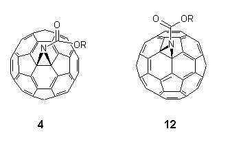 In the course of the studies at Edinburgh just described, HPLC analysis (Fullerenesep10, 2 ml/min, 7% ethyl acetate:n-hexane, 258 nm) of the crude reaction mixtures established that the [6,6]-bridged aziridinofullerenes 4a-c were accompanied in each case by a minor product in the ratio ca. 8:1, irrespective of the mode of formation18,20. By combining the outcome of several reaction mixtures with careful flash chromatography on silica (n-hexane:toluene), it has become possible to isolate and characterise these minor products as being isomeric with the closed [6,6]-bridged major products 4a-c. Thus, molecular ions were found by FAB-MS at the following values: 12a:(M++1) 1024.22345, C79H30NO2 requires 1024.22354; 12b:(M++1) 808.03577, C63H6NO2 requires 808.03985; 12c:(M++1) 836.06967, C65H10NO2 requires 836.07115. Further support for structural isomerism also came from the close similarity of the respective 1H NMR spectra. Comparison of the FT-IR spectra also verified the integrity of the oxycarbonylaziridine moiety with carbonyl bands at 1749.6 cm-1 for 12a (cf. 1752.3, 4a), 1731.6 for 12b (1743.0, 4b) and 1731.8 for 12c (1738.0, 4c). Likewise, the 13C NMR spectra for 12a-c showed carbonyl resonances at 152.01 ppm (cf. 152.8, 4a), 153.97 (155.5, 4b) and 153.04 (154.4, 4c) respectively, and in each case resonances due to the R group at values very close to those recorded for the 6,6-bridged aziridinofullerenes 4a-c.