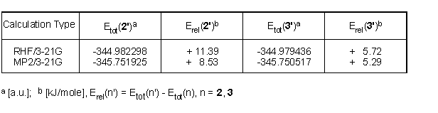 Two additional coplanar conformers of 2 and 3, i.e. 2' and 3', being rotamers with respect to the alfa-carbonyl bond, have explicitly been investigated in semiempirical as well as in RHF and MP2 calculations employing the 3-21G basis set. They were found to be significantly higher in energy than 2 and 3, respectively. If interested in these data, click here.