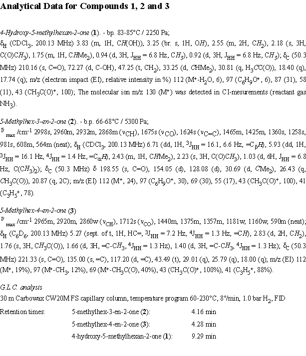 Hexacarbonyl molybdenum was obtained from FLUKA and used as received, all other catalyst precursors were prepared according to ref. [3]. 4-Hydroxy-5-methylhexan-2-one was prepared by a modification of a published procedure [11] from iso-butyric aldehyde and acetone in the presence of 2.5 N aqueous sodium hydroxide and obtained in 80% yield after distillation. [12]