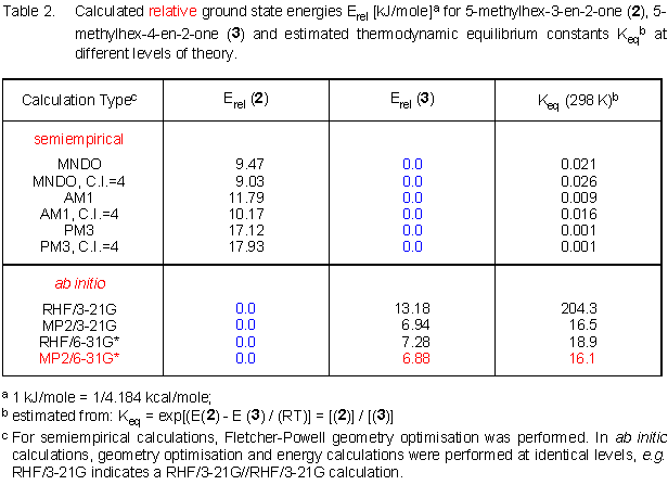 The preference for the conjugated isomer from MP2/6-31G* calculations amounts to about 6.9 kJ/mole (bottom part of Table 2). As a raw estimate for the thermodynamic product ratio, equilibrium constants calculated for 298 K are also given in Table 2. The value of about 16 from the MP2/6-31G* results is still relatively large compared to the experiments. The absolute energies obtained in the semiempirical and ab initio calculations are given in Table 3a and 3b, respectively. Furthermore, the ab initio geometries (pdb data format) of 5-methylhex-3-en-2-one (2) and 5-methylhex-4-en-2-one (3) at the MP2/6-31G*//MP2/6-31G* level are available. Most remarkably about these geometries, even for the beta,gamma-unsaturated ketone an almost coplanar arrangement of ketone and alkene moieties is found.