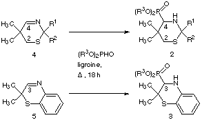 We also investigated the nature of the imine component on the rate of formation. According to their lower stability we obtained the phosphite adducts of 2H-1,3-thiazines in lower yields than 1,3-thiazolines and 2H-1,4-benzothiazines. Generally we received the diethylphosphite adducts with higher yields up to 74% than the dimethylphosphite derivates.