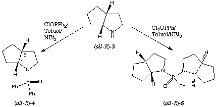 (all-R)-4: The amine (all-R)-3 (1 eq) was dissolved in dry toluene, 1.5 equivalents of triethylamine was added and the solution was cooled with an ice-bath. Diphenylphosphinic chloride (1 eq) was slowly added and after completly addition the mixture was stirred at room temperature for 24 h. The triethylamine hydrochloride was removed by filtration. The toluene distilled off under reduced pressure. Pure (all-R)-4 was obtained from crude (all-R)-4 as a colourless solid (yield = 43%[8]) by recrystallisation from toluene.