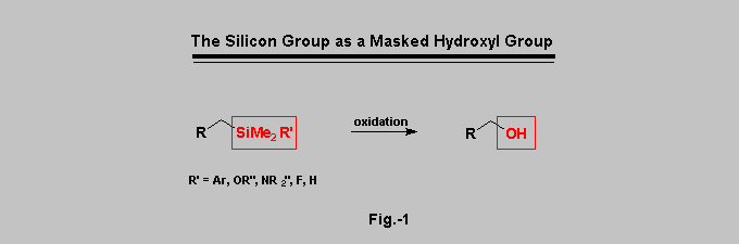 Since its discovery independently by Tamao-Kumada and by Fleming [1][2][3], the oxidation of the carbon-silicon bond to the corresponding carbon-hydroxyl bond has become a common and widely employed tool in organic synthesis (Fig.-1). The use of a masked hydroxyl group is indeed very convenient and avoids the sometimes troublesome protection- deprotection sequence required by the presence of a free hydroxyl group. ArMe2Si and (RO)Me2Si groups are among the most versatile masked hydroxyl groups but they also present some drawbacks [1][2].