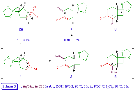 Ring expansion of the dioxolane 2a was attempted under various conditions. Thermolysis [10] at 200 for several hours gave a complex mixture of unidentified compounds. Heating with silver nitrate in aqueous acetone under reflux gave only starting material. However, treatment with silver acetate in acetic acid appeared to give the ring-expanded acetates 5 and 6 (total 40%, ratio 7:4), along with several unidentified compounds (Scheme 3). While the regiochemical relationship between the acetates 5 and 6 can be deduced by comparison of their n.m.r. spectra, the exo stereochemistry of the acetoxy group in each product is assigned on the basis of the reaction mechanism [5]. Hydrolysis and pyridinium chlorochromate (PCC) oxidation of the mixture of 5 and 6 afforded a low yield of a ketone, tentatively identified as 7 on the basis of the olefinic doublet in its proton n.m.r. spectrum (it is assumed that the corresponding signal in the regioisomer 8 would appear as a triplet). Similar complex mixtures and poor yields were observed on repeating the above sequence with the dibromocarbene adduct 2b.