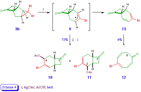 The tricyclic ketones 3 proved more interesting from a synthetic viewpoint. Both reacted quite cleanly with silver acetate in acetic acid to give mixtures of ring expansion products, the best results being obtained with the dibromotricycle 3b (Scheme 4). Two stereoisomeric products were obtained in good yield, and easily distinguished by n.m.r. spectroscopy. The major product was 10 (50%), in which the olefinic (2-H) and carbinol (4-H) signals appeared as doublet and triplet respectively. In the minor regiosiomer 11 (25%) the olefinic signal (4-H) was more complex and the carbinol (2-H) signal narrower. A minor product 12 was identified as the cyclooctatrienone 12 (4%), which presumably arises via loss of a proton from the intermediate cation 9 (or a related species), leading to the formation of the bicyclo[4.2.0]octa-2,4-dienone 13, which undergoes valence tautomerisation to give the observed product [11].
