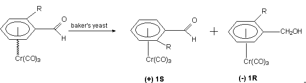 Some aldehyde complexes were obtained in good optical purity through a cinetic resolution with baker's yeast. Stopping the reduction reaction at about 50% conversion, we recovered, after chromathographic separation, aldehydes and the corresponding alcohols in a range of 56-90% enantiomeric excesses [3-5].