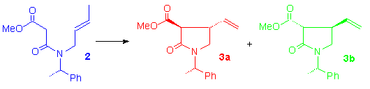 In order to obtain either 1a or 1b, the amide 2, containing the (S)-phenylethylamine as the chiral auxiliary, has been cyclised with Mn(OAc)3-Cu(OAc)2. A diastereomeric mixture (d.r. 70:30) of pyrrolidin-2-ones 3a and 3b is obtained in 53% yield. After silica gel chromatography, pure 3a and 3b are isolated and the configurations are assigned on the basis of 1H NMR spectra and confirmed by n.O.e. experiments. The moderate distereoselection can be explained through molecular mechanics calculations.