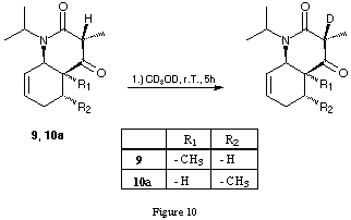 The cross-peaks between the methine H at C(3) and the olefinic H at C(8) as well as the cross-peaks between the H at C(8a) and the pseudo-axial H of the methylene group at C(5) are only compatible with such a locked conformation. A further indication for this strong conformational preference came from the deuterium exchange experiment (figure 10).