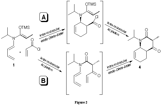 Instead of the planned tandem reaction Diels-Alder reaction/[3,3]-sigmatropic shift an unexpected tandem reaction Diels-Alder reaction/acylation was observed leading to interesting bicyclic and tricyclic products 2,3 and 4 in good yields (see figure 1). The combination of a Diels-Alder reactions with an acylations has not been used very often. Most of the reported cases14,15,16,17 are one-pot reactions starting with the N-acylations of the adequate imines with acid chlorides forming a C-N bond first leading to an N-butadienyl amide, which is itself the starting material for the subsequent Diels-Alder reaction. In contrast to the cases reported in the literature our tandem reaction forms three C-C bonds: one during the acylation and two during the Diels-Alder reaction. The products we obtained in our tandem reaction can be explained by the sequence intermolecular acylation between the N,O-keteneacetal and an acid chloride forming a C-C bond first followed by an intramolecular Diels-Alder reaction or by the alternative sequence: intermolecular Diels-Alder reaction first followed by intramolecular acylation second (figure 2).