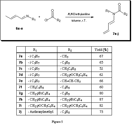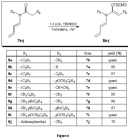 The N-alkyl-N-butadienyl amides 7a - j were obtained in good to excellent yields starting from crotonaldehyde, the alkyl amine and the corresponding acid chloride. We decided to try to synthesise the N-butadienyl-N-isopropylketene-N,O-tert.-butyldimethylsilylcetal of propionamide first which should be considerably more stable than the trimethylsilyl derivatives. The in situ deprotonation silylation which had been highly successful for the synthesis of the N-butadienyl-N-isopropylketene-N,O-trimethylsilylacetal of propionamide 112,13 could not be applied for the synthesis of the ketene-N,O-tert.-butyldimethylsilylacetal. Only after considerable optimisation of the reaction conditions following the prescription described by Rathke 20 good and reproducible yields of the N-butadienyl-N-isopropylketene-N,O-tert.-butyldimethylsilylcetal of propionamide 8a - j could be obtained (figure 6).
