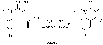 Acylation reactions of ketene-N,O-acetals are usually catalysed by Lewis acids. In our tandem process no Lewis acid had been added. The LiCl present in the reaction mixture using the ketene-N,O-trimethylsilylacetal 1 synthesised in situ could possibly act as a weak Lewis acid. Using the pure ketene-N,O-tert.-butyldimethylsilylacetal 8a free of LiCl and diisopropylamine and submitting it to the reaction conditions optimised for the ketene-N,O-trimethylsilylacetal the bicyclic product 4 could be obtained in 50 % yield (figure 7).