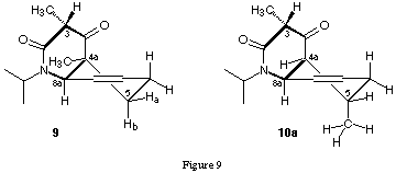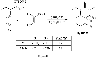 The TLC-analysis of the reaction mixture indicated that during the reaction several side products were formed. The chromatographic isolation of the bicyclic products 9, 10a/b proved to be tedious and time consuming. Using methacryl chloride as dienophile one single diastereoisomer 9 was obtained. In the case of the crotonyl chloride, the starting material was a 4 : 1 mixture of the (E)- and (Z)-diastereoisomer. The product obtained after the reaction of crotonyl chloride with the ketene-N,O-tert.-butyldimethylsilylacetal 8a was a mixture of the diastereoisomers 10a and 10b at the position C(5). One of the two diastereoisomers 10a could be crystallised directly from the mixture. The relative configuration of the tandem products was determined with the help of NOESY-spectra. The cis-junction of the two rings was evident from the cross-peaks between the H at the bridgehead positions. The bicycles are in a half-chair/boat conformation locked by the isopropyl group of the lactame nitrogen (figure 9).