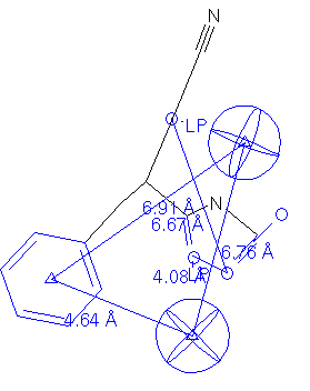 QUERY DEFINITION: In ISIS/3D, queries are defined using several objects and constraints, which can be selected from a menu. Once added to a structure or query, objects and constraints can be output to standard molecule files. In general, queries will be derived either from the literature or from structures with known activity. In the first case, the 2D substructural features of the query are drawn by the user, who then adds 3D objects and constraints. In the second case, an active structure is brought into ISIS/Draw, the user prunes away the unnecessary portions of the molecule, any atom and bond types are optionally changed, and finally, any other 2D or 3D features are added to create the query. For all searches involving hydrogen or lone-pair atoms, automatic sprouting was conducted at search time, since this information is not stored in the 3D database. Sprouting used standard bond lengths, bond angles, and the perceived valency of the structure atom. The CFS searches are performed with only one difference from the default options: The maximum allowed unique mappings were increased from the default value of 5 to 99.