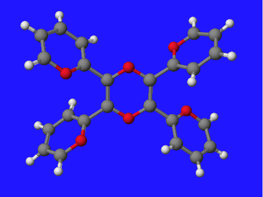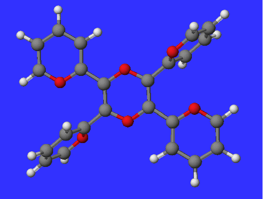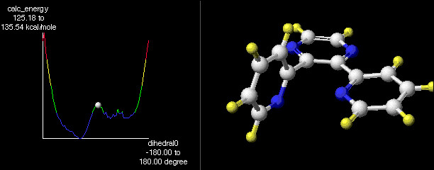 Figure 3 shows the energy map resulting from a MOPAC dihedral drive calculation. One of the pyridyl rings was rotated in 5 degree increments about the pyridyl-pyrazine bond, beginning from a co-planar pyridyl-pyrazine orientation. The rest of the molecule was energy minimized at each step. Figure 3 plots heats of formation vs dihedral angle.