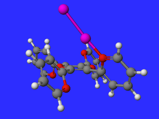 MOPAC calculations gave a very different result when an I2 complex is generated from the monoclinic tpp structure 2. The optimized structure is a local minima (10) that is perturbed only slightly from the starting compound. Enthalpy calculations predict that this structure is significantly higher in energy than the conformers generated from the tetragonal form and the formation of such a structure was found to be endothermic by about 0.56 kcal.