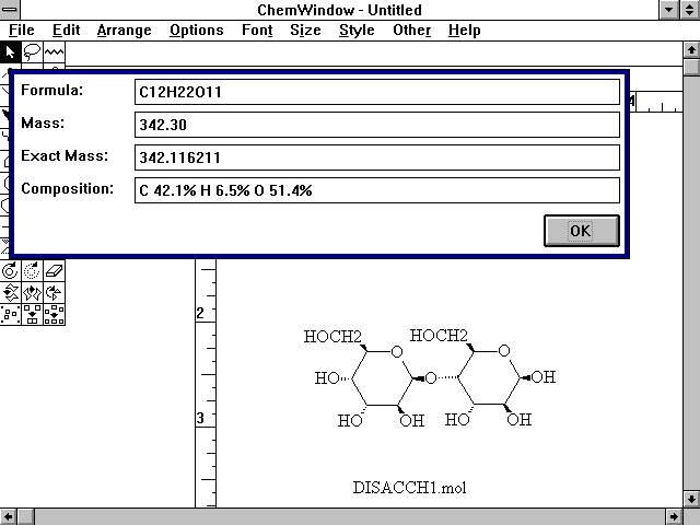Fig.8 is a screen view of the molfile(disacch1.mol) when drawn and checked with ChemWindow(v3.1).