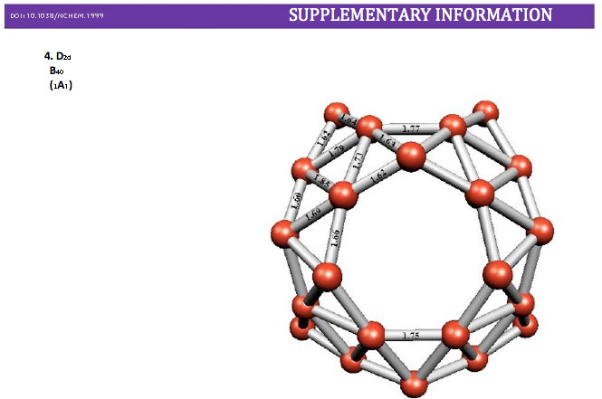 Whilst clusters of carbon atoms are well-known, my eye was caught by a recent article describing the detection of a cluster of boron atoms, B40 to be specific.[1] My interest was in how the σ and π-electrons were partitioned. In a C40, one can reliably predict that each carbon would contribute precisely one π-electron. But boron, being more electropositive, does not always play like that. Having one electron less per atom, one might imagine that a fullerene-like boron cluster would have no π-electrons. But the element has a propensity[2] to promote its σ-electrons into the π-manifold, leaving a σ-hole. So how many π-electrons does B40 have? These sorts of clusters are difficult to build using regular structure editors, and so coordinates are essential. The starting point for a set of coordinates with which to compute a wavefunction was the supporting information. Here is the relevant page: